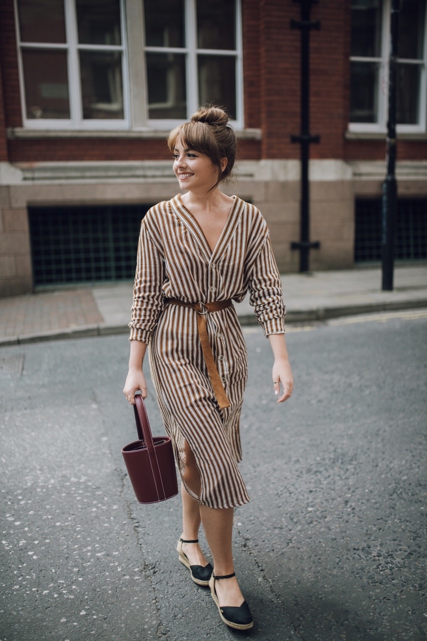 This dress for example – it’s quite a bold all over print, and usually something I’d be self conscious about wearing, but I’m absolutely smitten with it and it makes me feel like I’m heading to some kind of seventies beach resort. I love the brown stripe pattern – it has a real vintage feel to it, and has proven to be the perfect sunny weekend strolling attire. I love that I can play around with the buttons and shape of the dress too – you can wear it slightly off the shoulders, or slouched just off the one shoulder, I can even undo some of the lower buttons for a bit more leg action if I’m feeling adventurous. It’s just one of those pieces that I feel great in, and I don’t think it will ever really go out of style. I’m really into minimal striped dresses – I just think they are endlessly classic and tend to suit everyone. The only thing to note about this dress is that it’s very oversized (I have the small for reference), and could probably have gone for the extra small for a bit more of a tailored fit.