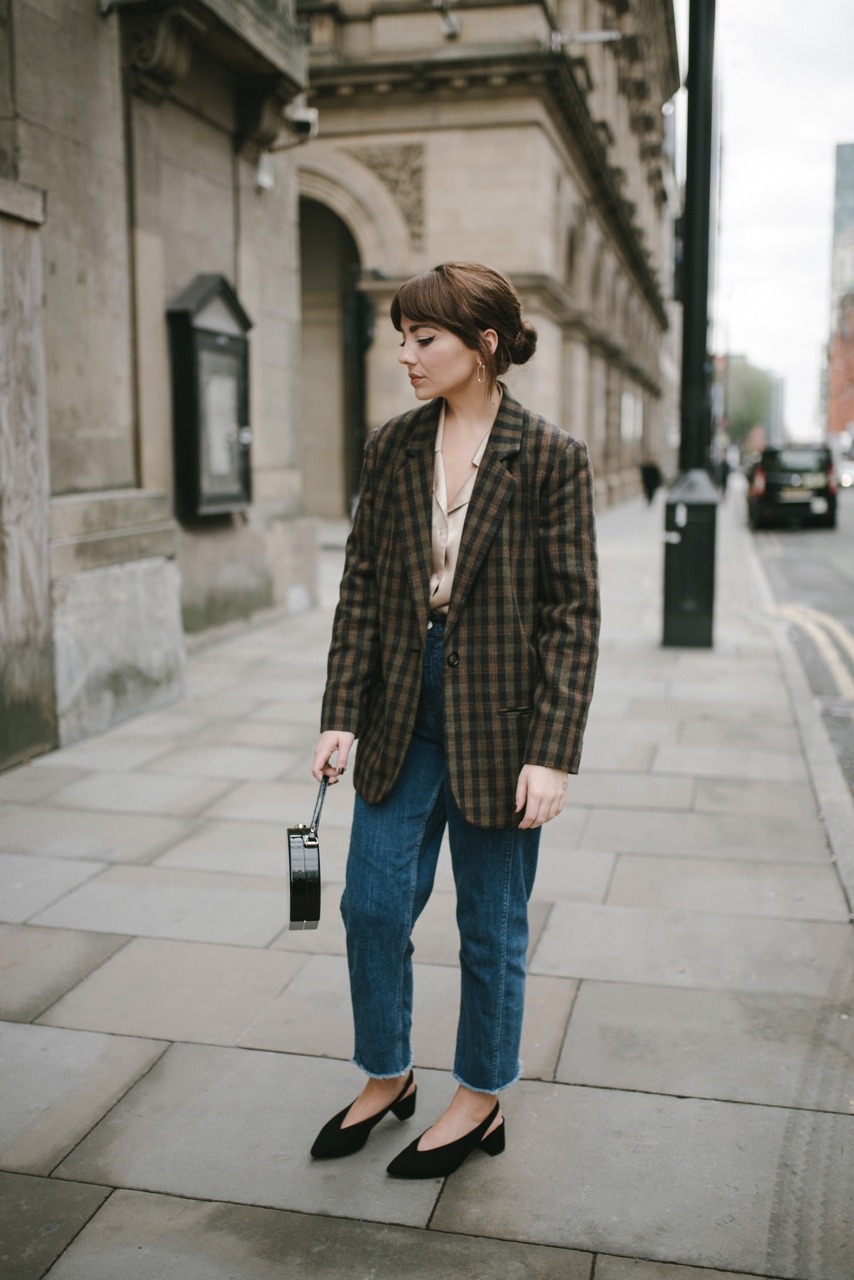 If I told you that I picked up the above check blazer and satin gold blouse for under thirty pounds, would you believe me? I probably wouldn’t believe me either – they are a match made in heaven and just the statement pieces my wardrobe was lacking for the party season ahead. I find it really fun to mix up the new and the old, some of my most favourite looks are a combination of the two. I would definitely encourage you to go and check out your local vintage stores, or failing that, just get acquainted with some of the previously mentioned platforms. Entering as many key words as possible is essential, and make sure you get to see at least three to five images of the item before clicking that purchase button. Always always always check the sizing too – I happen keep tape measures all over the flat for when I need one handy, and they really do help to ease your mind when investing online. The outfit above is one that I’d happily wear to an event or after work drinks and feel completely comfortable in – both vintage pieces are in pristine condition, and work amazingly when paired with denim. I’ve also been wearing the blazer with jumpers underneath for a more daytime look, and something tells me that the gold blouse would work really well underneath a pinafore dress too. I’d love to hear what your favourite vintage purchases (if any) have been in the comments below and whether you agree that there’s just something a little more magical about wearing vintage…