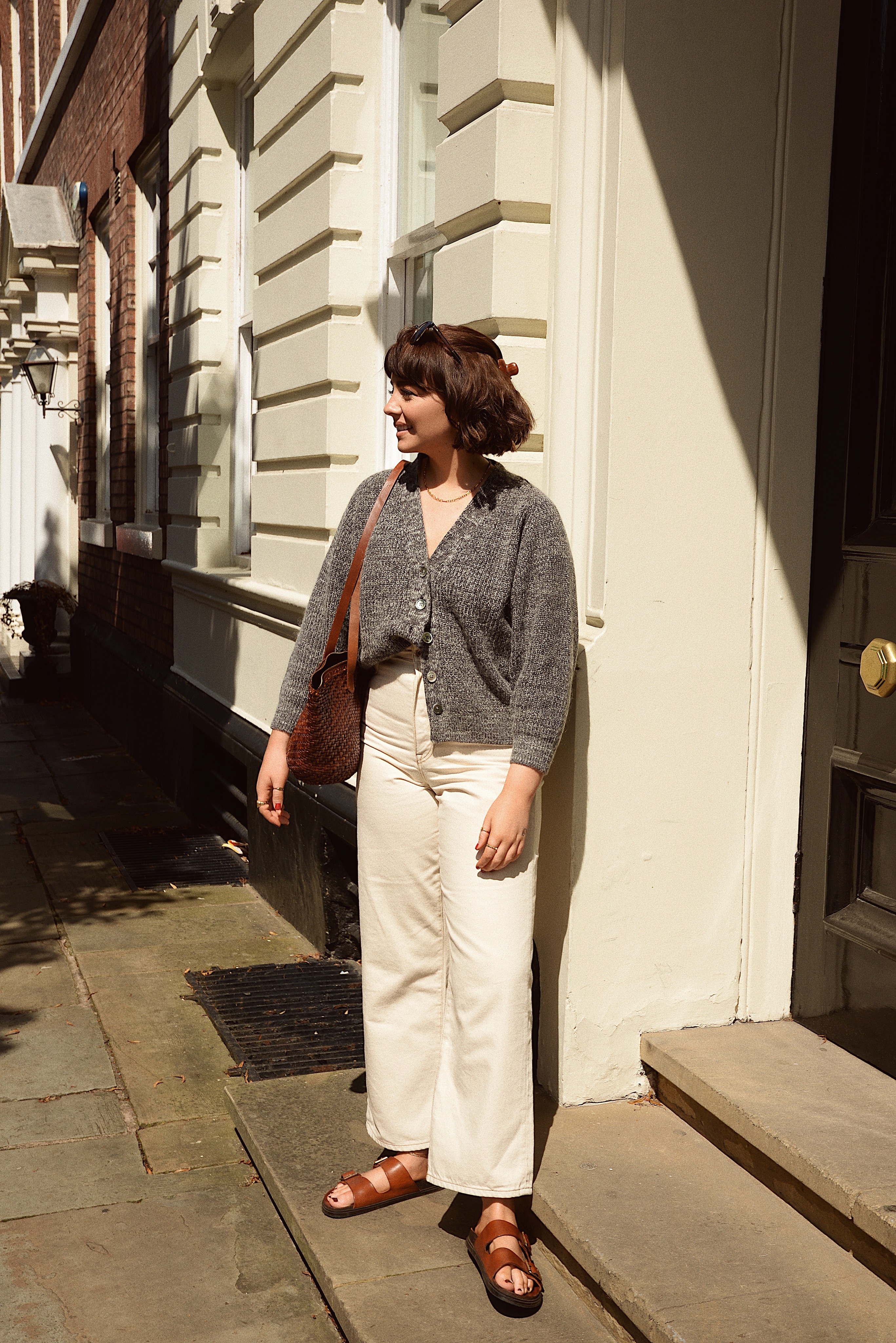 Cardigan c/o – Bellerose, Jeans c/o – Bellerose, Sandals c/o – Bellerose, Bag c/o – St Agni, Sunglasses – Gucci
